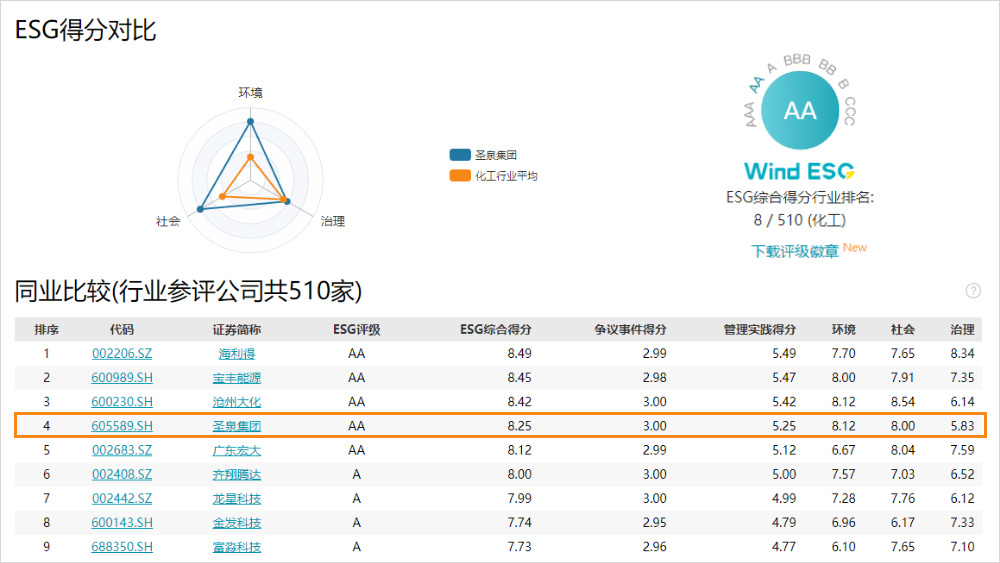 近日,业内知名的ESG评级机构万得(Wind)正式公布2024年度国内最新ESG评级数据。圣泉集团Wind ESG评级由A级提升至AA级,ESG综合得分8.25,在510家化工行业参评单位中名列前茅,充分彰显企业ESG管理水平和可持续发展能力。