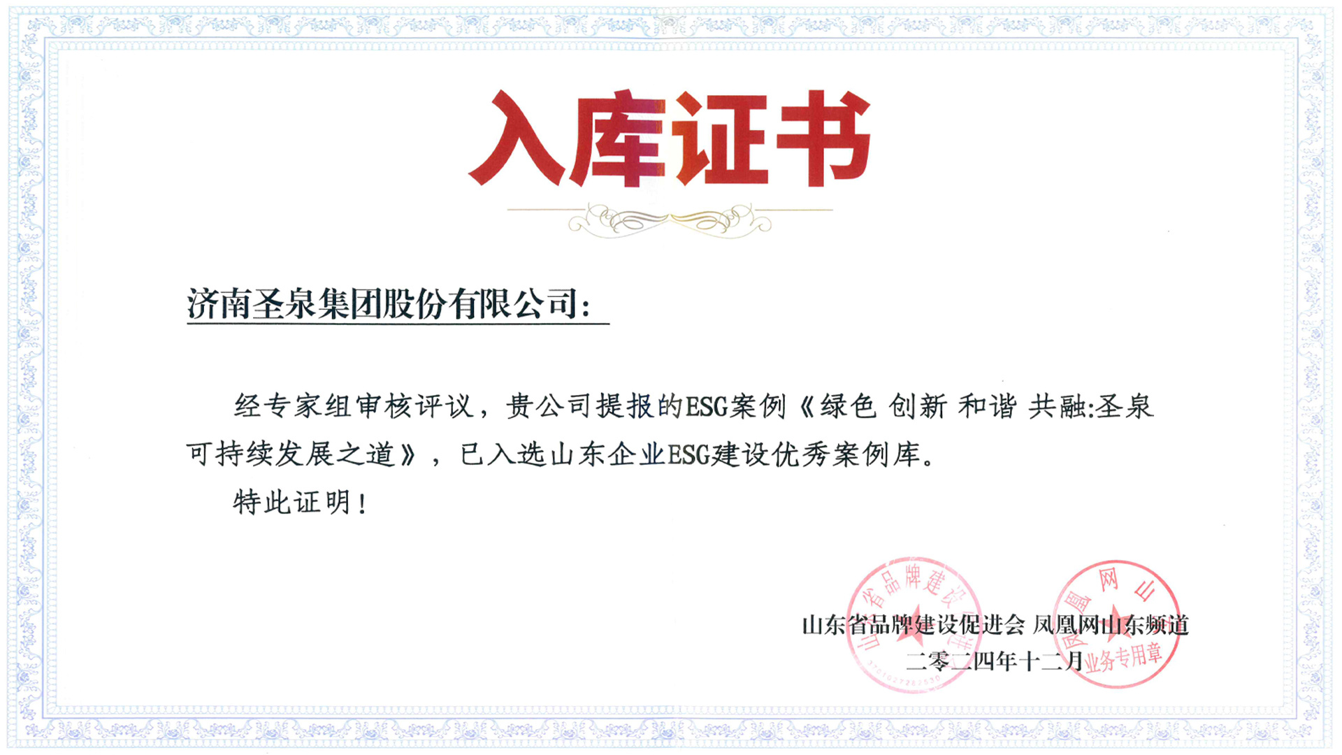 近日,由山东省品牌建设促进会、凤凰网山东频道主办的“2024山东品牌年会暨ESG建设与品牌价值提升论坛”在济南举办。会议总结了2024年度山东品牌建设情况,并发布山东企业ESG建设优秀案例库入库名单。济南圣泉集团股份有限公司提报的《绿色 创新 和谐 共融:圣泉可持续发展之道》成功入选。